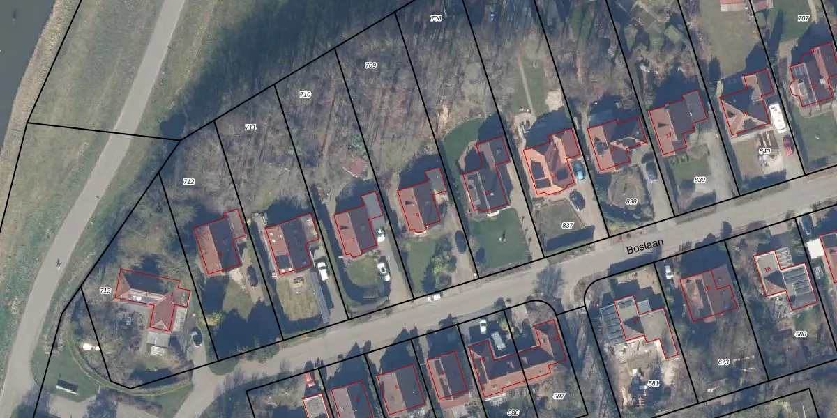 Het perceel waarop Boslaan 9 staat heeft een oppervlakte van 1063 m². Dit is een zeer groot perceel. De perceeloppervlakte wordt geregistreerd door het Kadaster. Gedetailleerde informatie over de maten van dit perceel kunt u vinden in het rapport Kadastrale kaart met maatvoering van Boslaan 9.