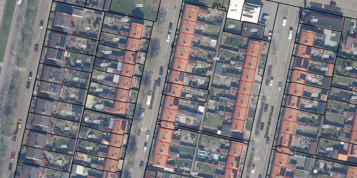 Het perceel waarop Breeuwerstraat 15 staat heeft een oppervlakte van 182 m². Dit is een middelgroot perceel. De perceeloppervlakte wordt geregistreerd door het Kadaster. Gedetailleerde informatie over de maten van dit perceel kunt u vinden in het rapport Kadastrale kaart met maatvoering van Breeuwerstraat 15.