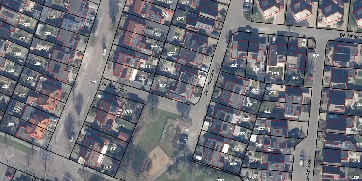 Het perceel waarop De Amazone 1 staat heeft een oppervlakte van 300 m². Dit is een groot perceel. De perceeloppervlakte wordt geregistreerd door het Kadaster. Gedetailleerde informatie over de maten van dit perceel kunt u vinden in het rapport Kadastrale kaart met maatvoering van De Amazone 1.