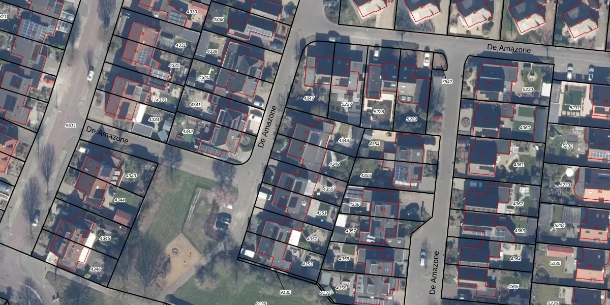 Het perceel waarop De Amazone 10 staat heeft een oppervlakte van 227 m². Dit is een middelgroot perceel. De perceeloppervlakte wordt geregistreerd door het Kadaster. Gedetailleerde informatie over de maten van dit perceel kunt u vinden in het rapport Kadastrale kaart met maatvoering van De Amazone 10.