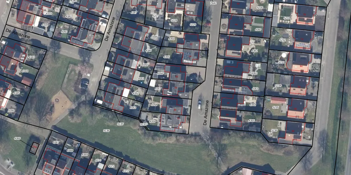 Het perceel waarop De Amazone 28 staat heeft een oppervlakte van 250 m². Dit is een middelgroot perceel. De perceeloppervlakte wordt geregistreerd door het Kadaster. Gedetailleerde informatie over de maten van dit perceel kunt u vinden in het rapport Kadastrale kaart met maatvoering van De Amazone 28.