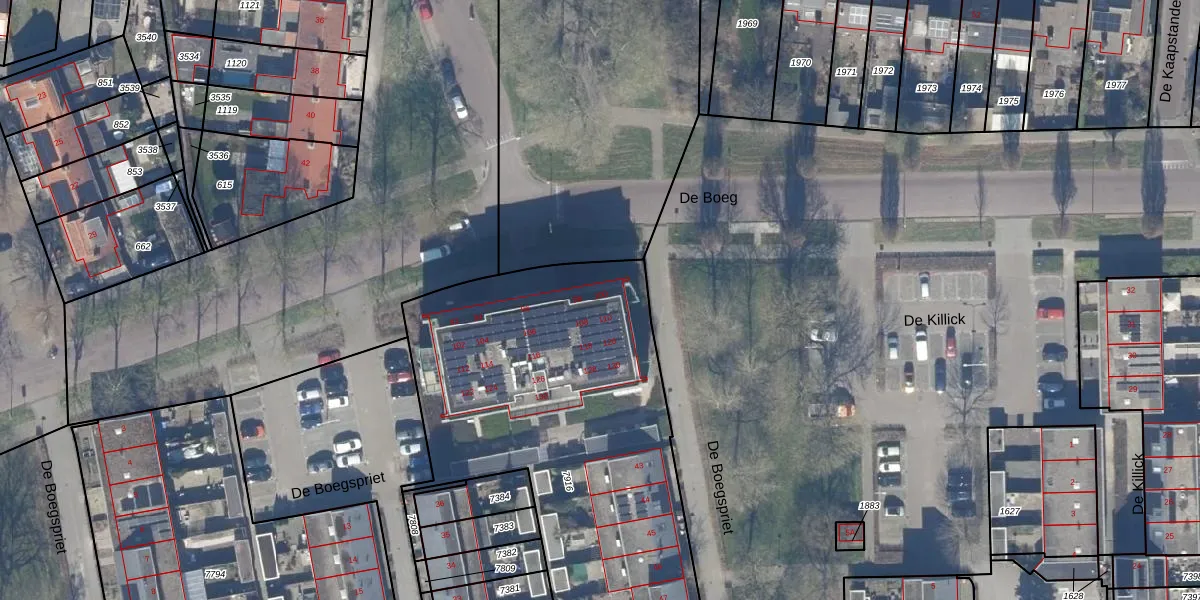 De Boeg 100 is gelegen op kadastraal perceel DTN01A7916. Deze kadastrale aanduiding is uniek en wordt gebruikt door het Kadaster om eigendomsrechten en andere zakelijke rechten vast te leggen. Het perceel maakt onderdeel uit van de kadastrale gemeente Dronten.