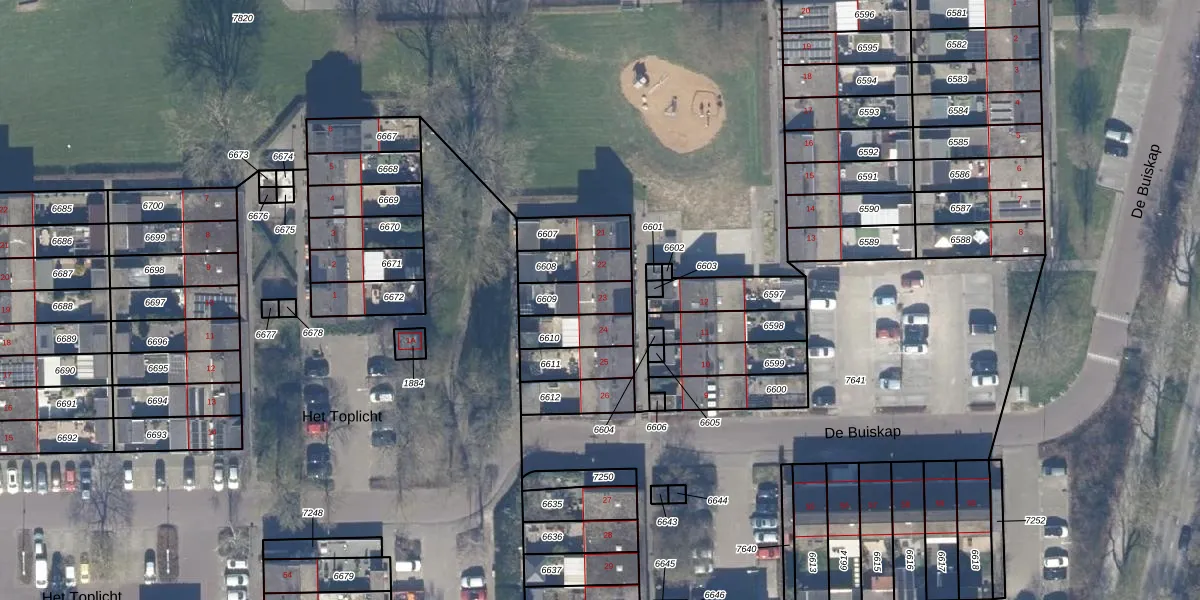 Het perceel waarop De Buiskap 23 staat heeft een oppervlakte van 102 m². Dit is een middelgroot perceel. De perceeloppervlakte wordt geregistreerd door het Kadaster. Gedetailleerde informatie over de maten van dit perceel kunt u vinden in het rapport Kadastrale kaart met maatvoering van De Buiskap 23.