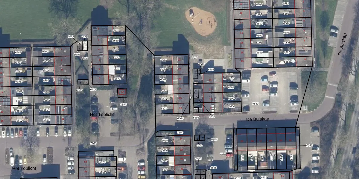 Het perceel waarop De Buiskap 24 staat heeft een oppervlakte van 102 m². Dit is een middelgroot perceel. De perceeloppervlakte wordt geregistreerd door het Kadaster. Gedetailleerde informatie over de maten van dit perceel kunt u vinden in het rapport Kadastrale kaart met maatvoering van De Buiskap 24.