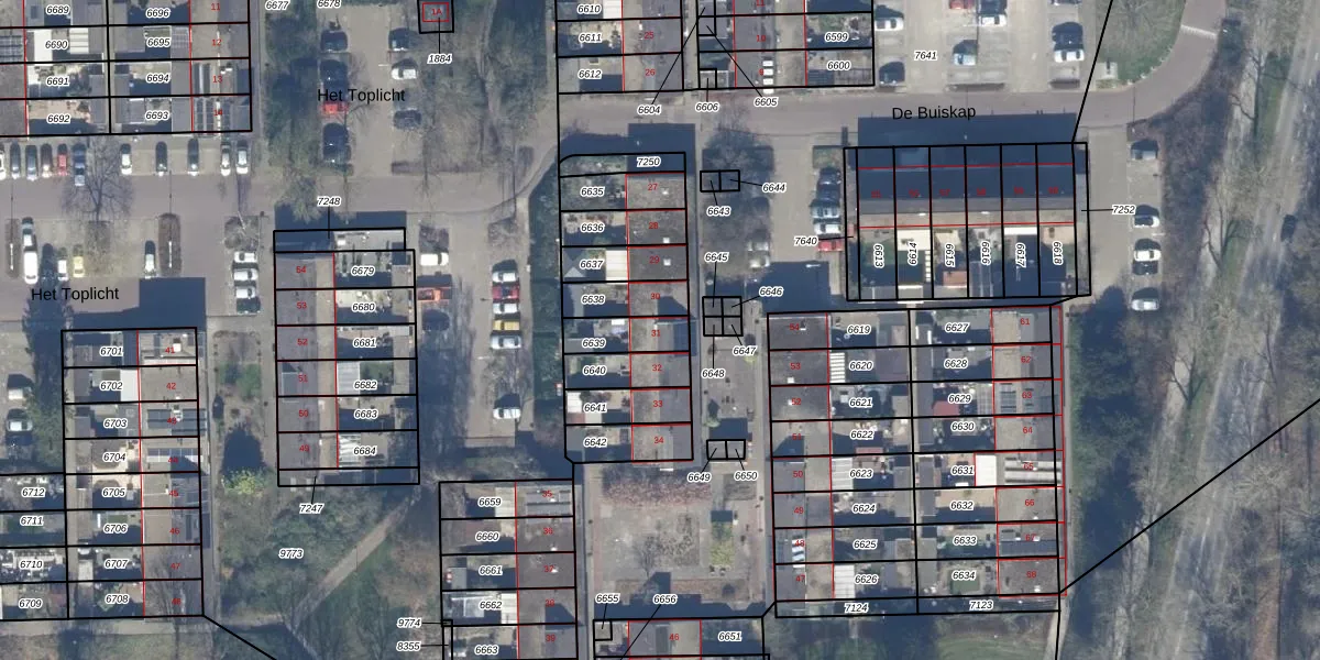 Het perceel waarop De Buiskap 31 staat heeft een oppervlakte van 102 m². Dit is een middelgroot perceel. De perceeloppervlakte wordt geregistreerd door het Kadaster. Gedetailleerde informatie over de maten van dit perceel kunt u vinden in het rapport Kadastrale kaart met maatvoering van De Buiskap 31.