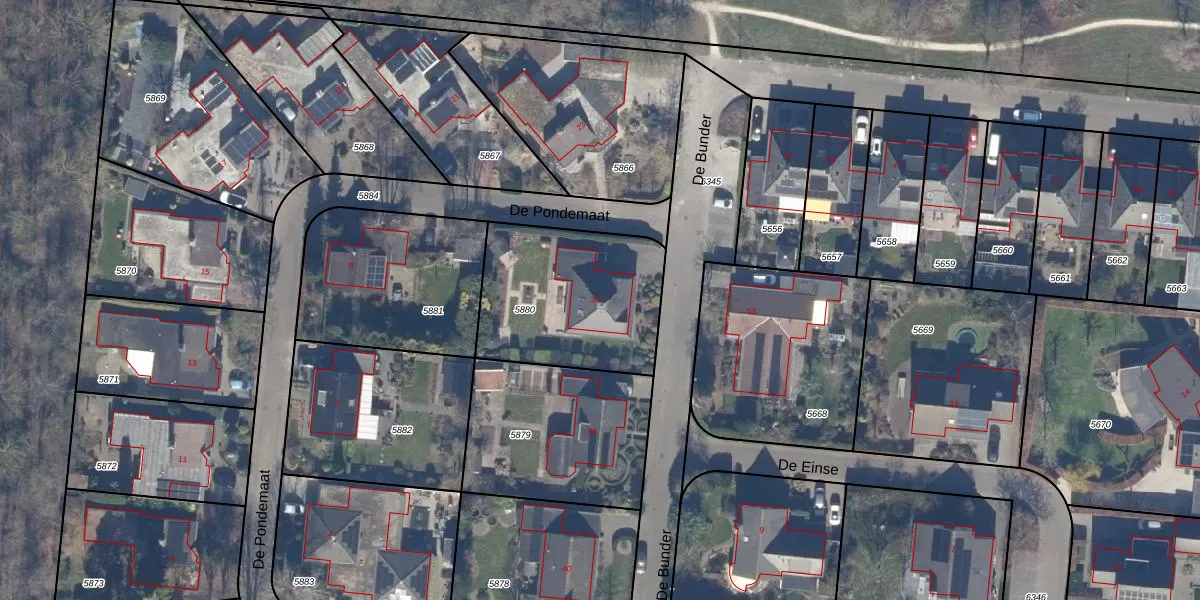 Het perceel waarop De Bunder 36 staat heeft een oppervlakte van 682 m². Dit is een groot perceel. De perceeloppervlakte wordt geregistreerd door het Kadaster. Gedetailleerde informatie over de maten van dit perceel kunt u vinden in het rapport Kadastrale kaart met maatvoering van De Bunder 36.