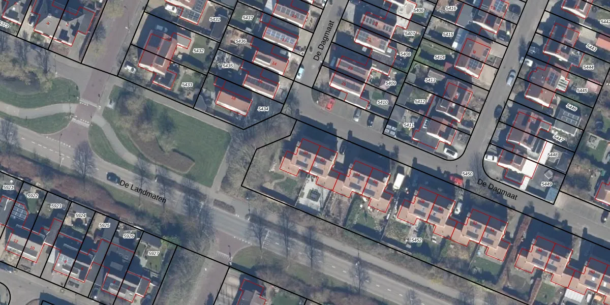 Het perceel waarop De Dagmaat 20 staat heeft een oppervlakte van 3500 m². Dit is een zeer groot perceel. De perceeloppervlakte wordt geregistreerd door het Kadaster. Gedetailleerde informatie over de maten van dit perceel kunt u vinden in het rapport Kadastrale kaart met maatvoering van De Dagmaat 20.