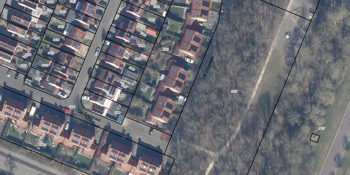 Het perceel waarop De Dagmaat 31 staat heeft een oppervlakte van 2418 m². Dit is een zeer groot perceel. De perceeloppervlakte wordt geregistreerd door het Kadaster. Gedetailleerde informatie over de maten van dit perceel kunt u vinden in het rapport Kadastrale kaart met maatvoering van De Dagmaat 31.