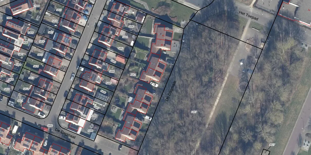 Het perceel waarop De Dagmaat 35 staat heeft een oppervlakte van 2418 m². Dit is een zeer groot perceel. De perceeloppervlakte wordt geregistreerd door het Kadaster. Gedetailleerde informatie over de maten van dit perceel kunt u vinden in het rapport Kadastrale kaart met maatvoering van De Dagmaat 35.