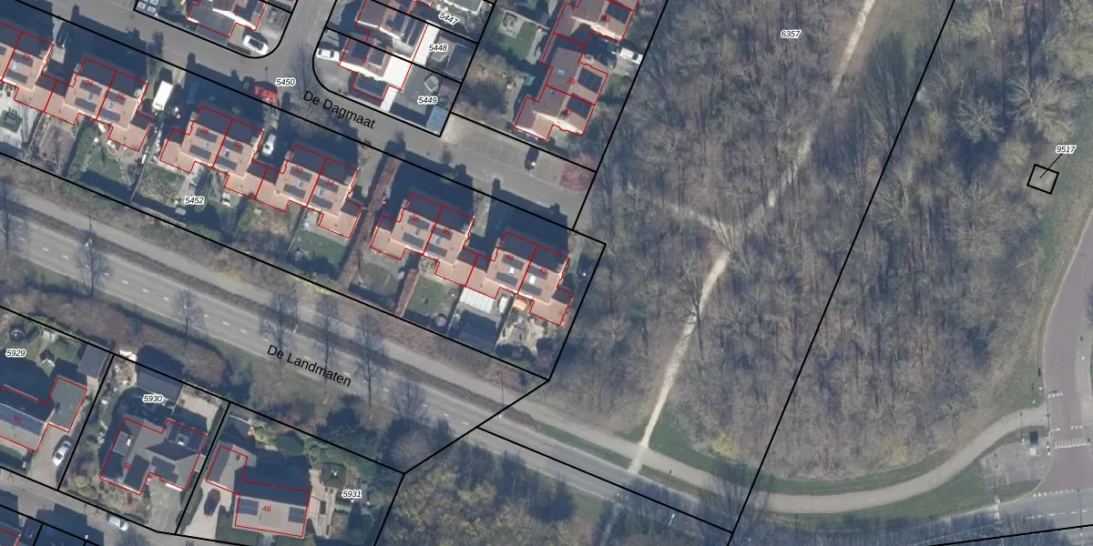 Het perceel waarop De Dagmaat 42 staat heeft een oppervlakte van 3500 m². Dit is een zeer groot perceel. De perceeloppervlakte wordt geregistreerd door het Kadaster. Gedetailleerde informatie over de maten van dit perceel kunt u vinden in het rapport Kadastrale kaart met maatvoering van De Dagmaat 42.