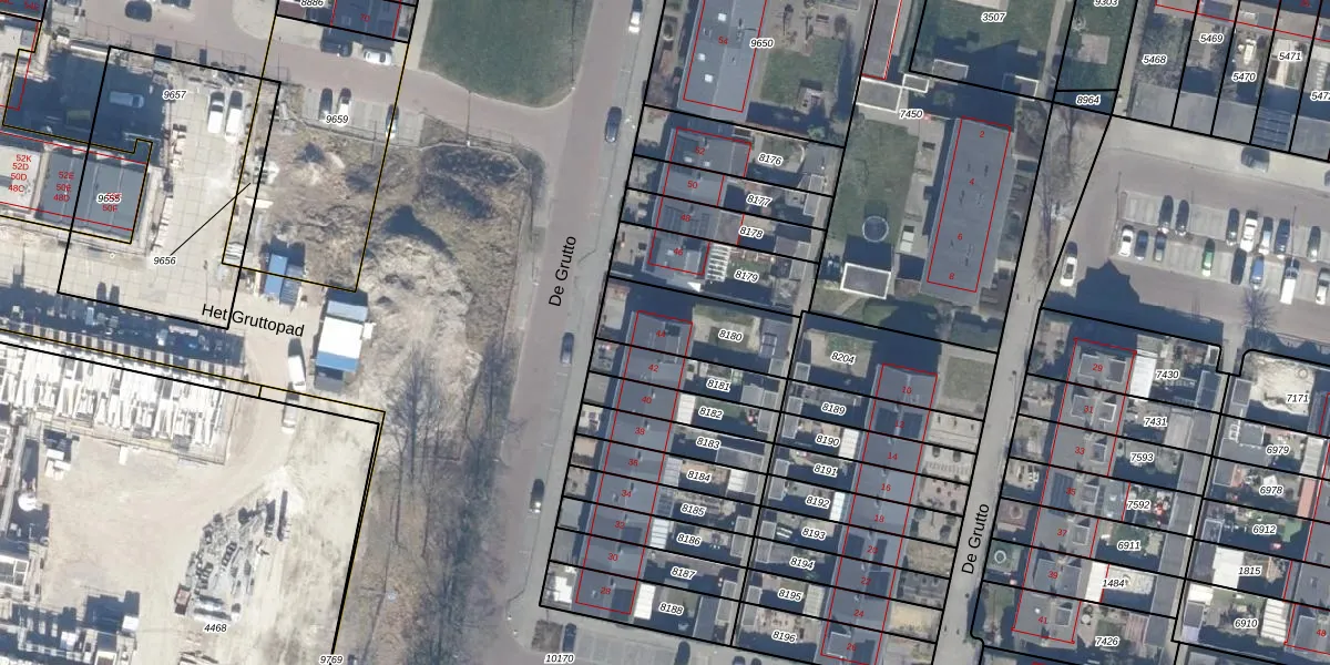 Het perceel waarop De Grutto 44 staat heeft een oppervlakte van 281 m². Dit is een middelgroot perceel. De perceeloppervlakte wordt geregistreerd door het Kadaster. Gedetailleerde informatie over de maten van dit perceel kunt u vinden in het rapport Kadastrale kaart met maatvoering van De Grutto 44.