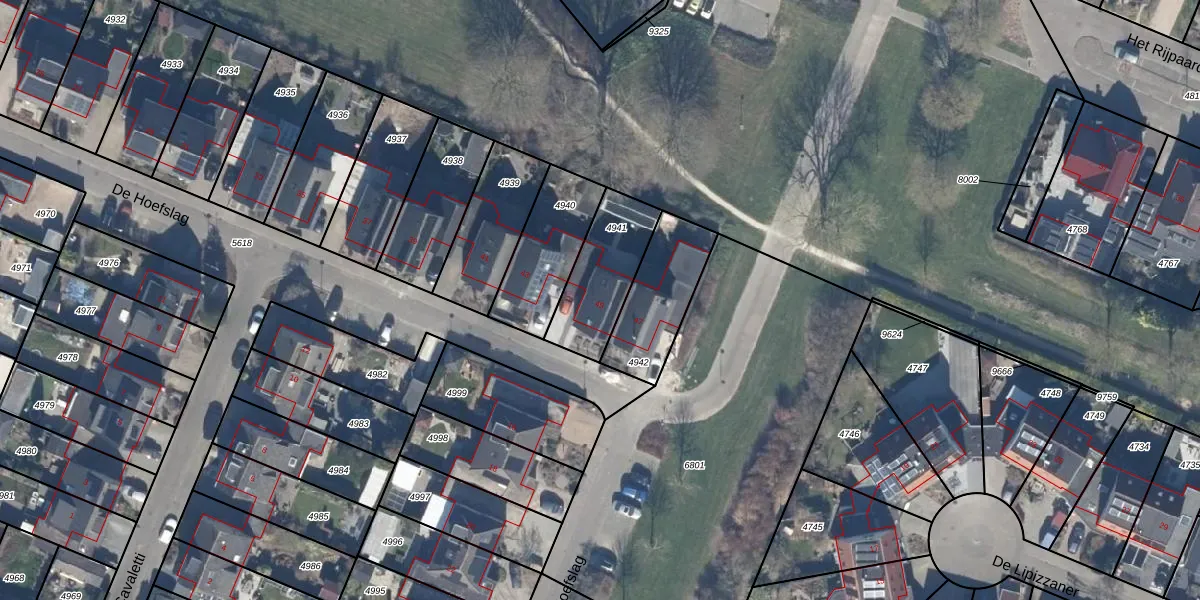Het perceel waarop De Hoefslag 45 staat heeft een oppervlakte van 277 m². Dit is een middelgroot perceel. De perceeloppervlakte wordt geregistreerd door het Kadaster. Gedetailleerde informatie over de maten van dit perceel kunt u vinden in het rapport Kadastrale kaart met maatvoering van De Hoefslag 45.