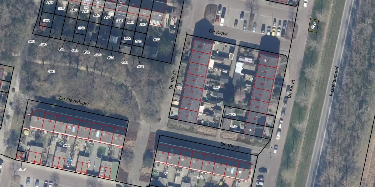 Het perceel waarop De Kievit 44 staat heeft een oppervlakte van 2187 m². Dit is een zeer groot perceel. De perceeloppervlakte wordt geregistreerd door het Kadaster. Gedetailleerde informatie over de maten van dit perceel kunt u vinden in het rapport Kadastrale kaart met maatvoering van De Kievit 44.