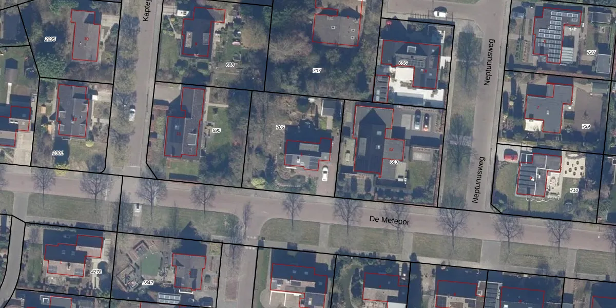 Het perceel waarop De Meteoor 1 staat heeft een oppervlakte van 971 m². Dit is een groot perceel. De perceeloppervlakte wordt geregistreerd door het Kadaster. Gedetailleerde informatie over de maten van dit perceel kunt u vinden in het rapport Kadastrale kaart met maatvoering van De Meteoor 1.