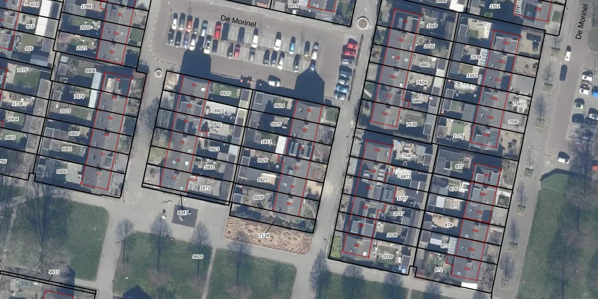 Het perceel waarop De Morinel 90 staat heeft een oppervlakte van 187 m². Dit is een middelgroot perceel. De perceeloppervlakte wordt geregistreerd door het Kadaster. Gedetailleerde informatie over de maten van dit perceel kunt u vinden in het rapport Kadastrale kaart met maatvoering van De Morinel 90.
