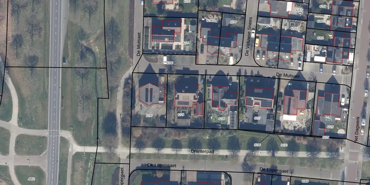 De Mutsaet 9 is gelegen op kadastraal perceel DTN01A6229. Deze kadastrale aanduiding is uniek en wordt gebruikt door het Kadaster om eigendomsrechten en andere zakelijke rechten vast te leggen. Het perceel maakt onderdeel uit van de kadastrale gemeente Dronten.