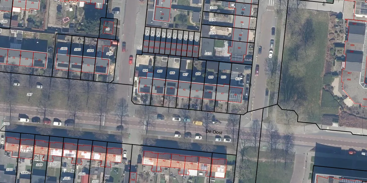 Het perceel waarop De Oost 41 staat heeft een oppervlakte van 202 m². Dit is een middelgroot perceel. De perceeloppervlakte wordt geregistreerd door het Kadaster. Gedetailleerde informatie over de maten van dit perceel kunt u vinden in het rapport Kadastrale kaart met maatvoering van De Oost 41.