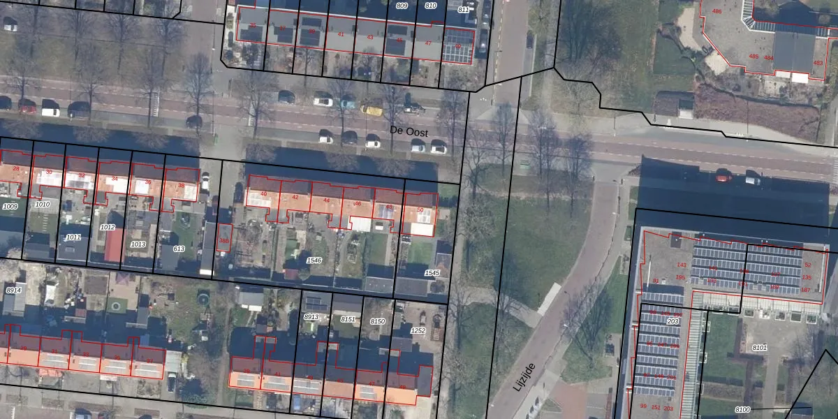 Het perceel waarop De Oost 50 staat heeft een oppervlakte van 362 m². Dit is een groot perceel. De perceeloppervlakte wordt geregistreerd door het Kadaster. Gedetailleerde informatie over de maten van dit perceel kunt u vinden in het rapport Kadastrale kaart met maatvoering van De Oost 50.