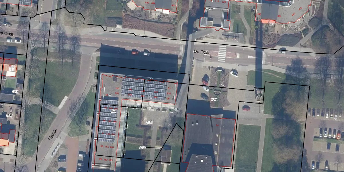 Het perceel waarop De Oost 52 staat heeft een oppervlakte van 1213 m². Dit is een zeer groot perceel. De perceeloppervlakte wordt geregistreerd door het Kadaster. Gedetailleerde informatie over de maten van dit perceel kunt u vinden in het rapport Kadastrale kaart met maatvoering van De Oost 52.