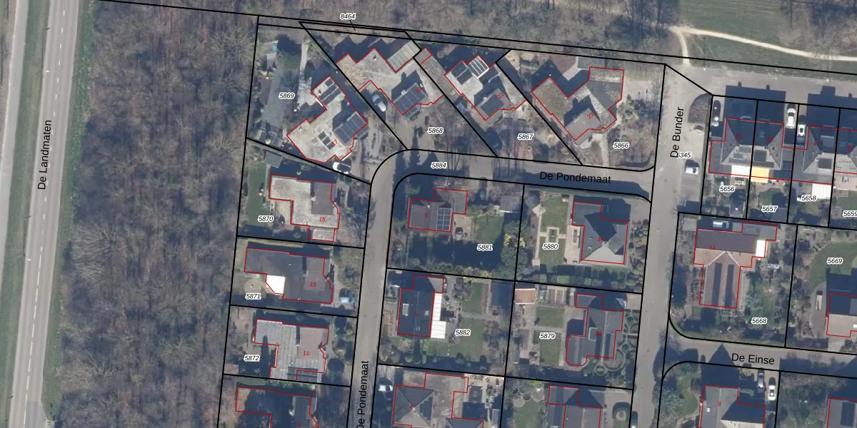 Het perceel waarop De Pondemaat 8 staat heeft een oppervlakte van 678 m². Dit is een groot perceel. De perceeloppervlakte wordt geregistreerd door het Kadaster. Gedetailleerde informatie over de maten van dit perceel kunt u vinden in het rapport Kadastrale kaart met maatvoering van De Pondemaat 8.