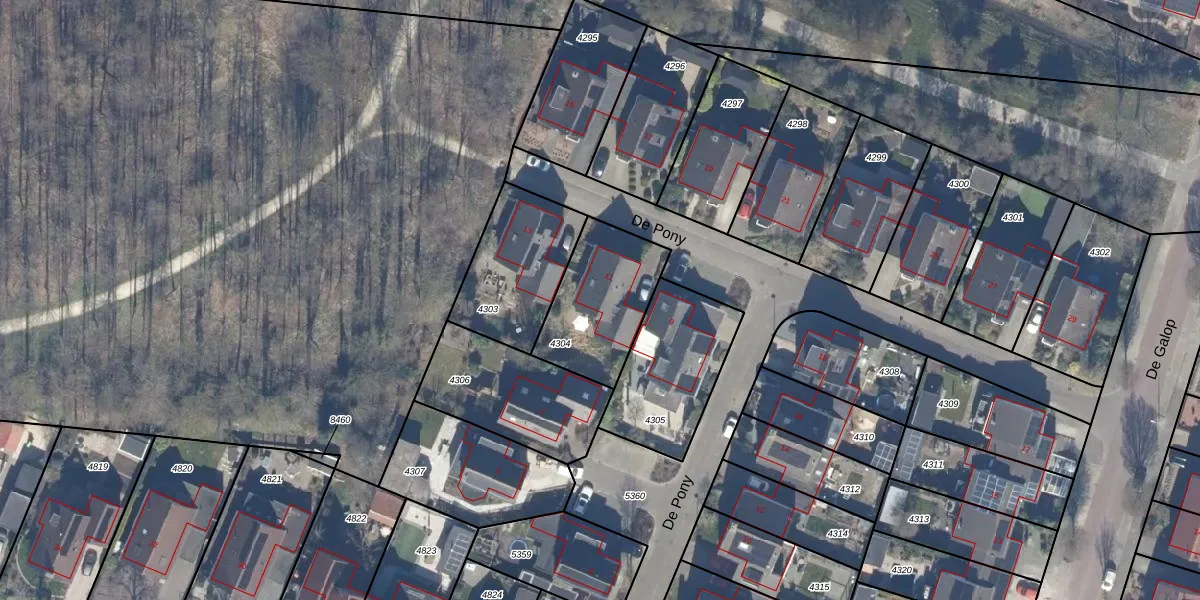 Het perceel waarop De Pony 11 staat heeft een oppervlakte van 377 m². Dit is een groot perceel. De perceeloppervlakte wordt geregistreerd door het Kadaster. Gedetailleerde informatie over de maten van dit perceel kunt u vinden in het rapport Kadastrale kaart met maatvoering van De Pony 11.