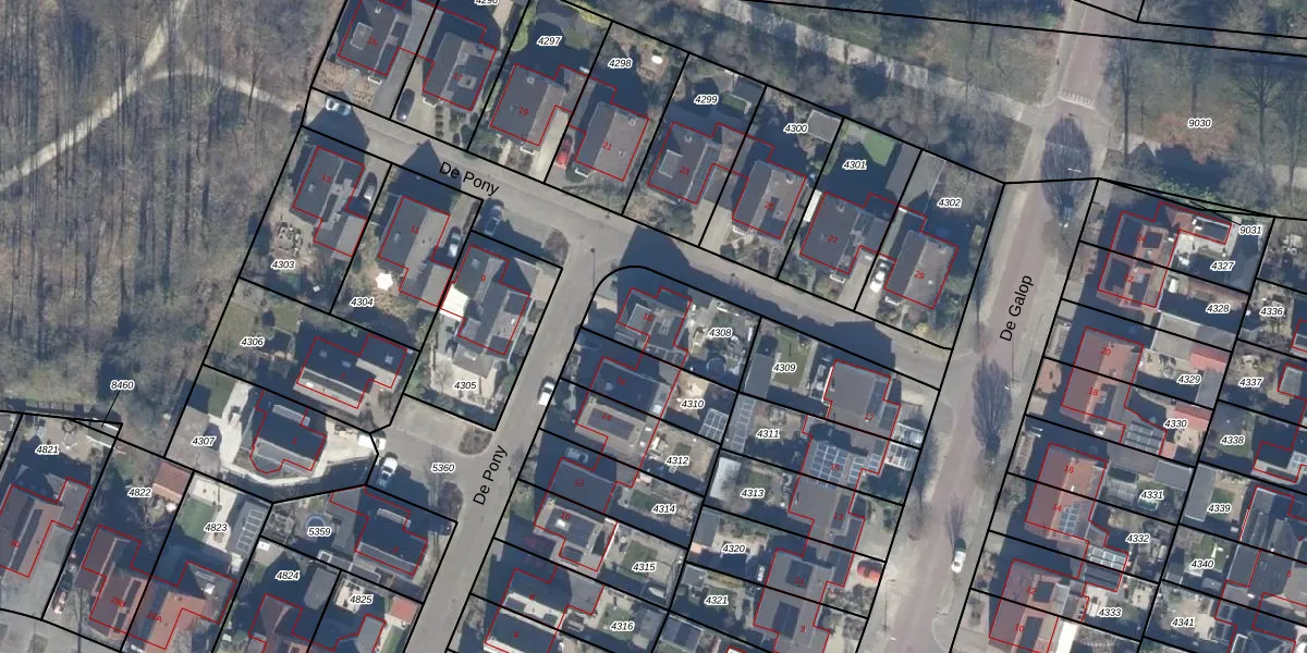 Het perceel waarop De Pony 18 staat heeft een oppervlakte van 301 m². Dit is een groot perceel. De perceeloppervlakte wordt geregistreerd door het Kadaster. Gedetailleerde informatie over de maten van dit perceel kunt u vinden in het rapport Kadastrale kaart met maatvoering van De Pony 18.