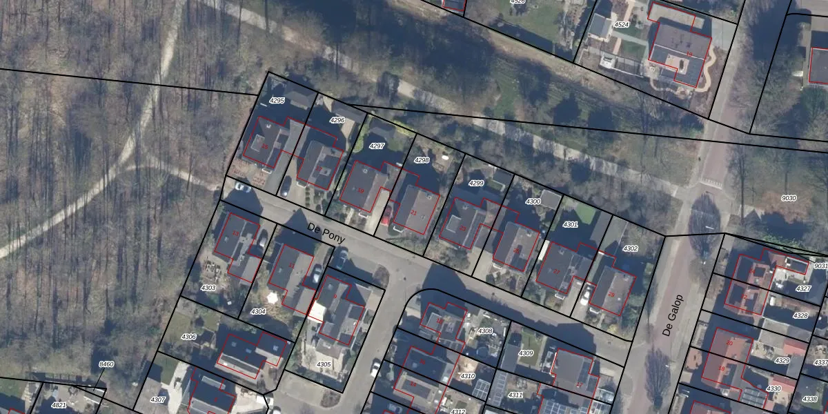 De Pony 21 is gelegen op kadastraal perceel DTN01A4298. Deze kadastrale aanduiding is uniek en wordt gebruikt door het Kadaster om eigendomsrechten en andere zakelijke rechten vast te leggen. Het perceel maakt onderdeel uit van de kadastrale gemeente Dronten.