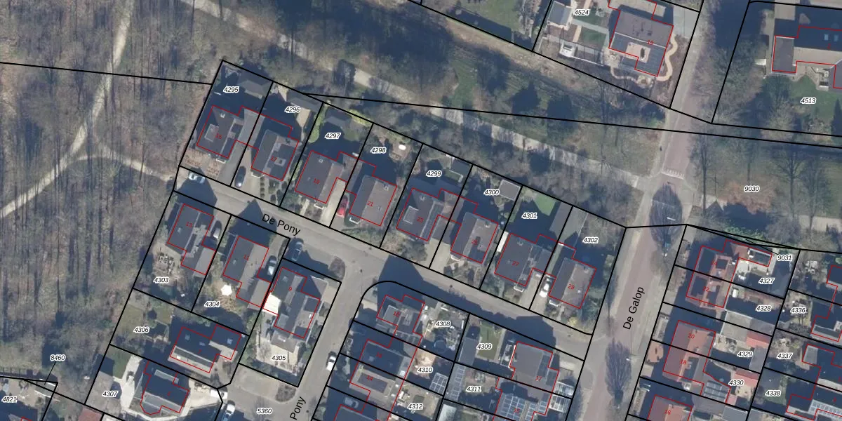 Het perceel waarop De Pony 23 staat heeft een oppervlakte van 345 m². Dit is een groot perceel. De perceeloppervlakte wordt geregistreerd door het Kadaster. Gedetailleerde informatie over de maten van dit perceel kunt u vinden in het rapport Kadastrale kaart met maatvoering van De Pony 23.