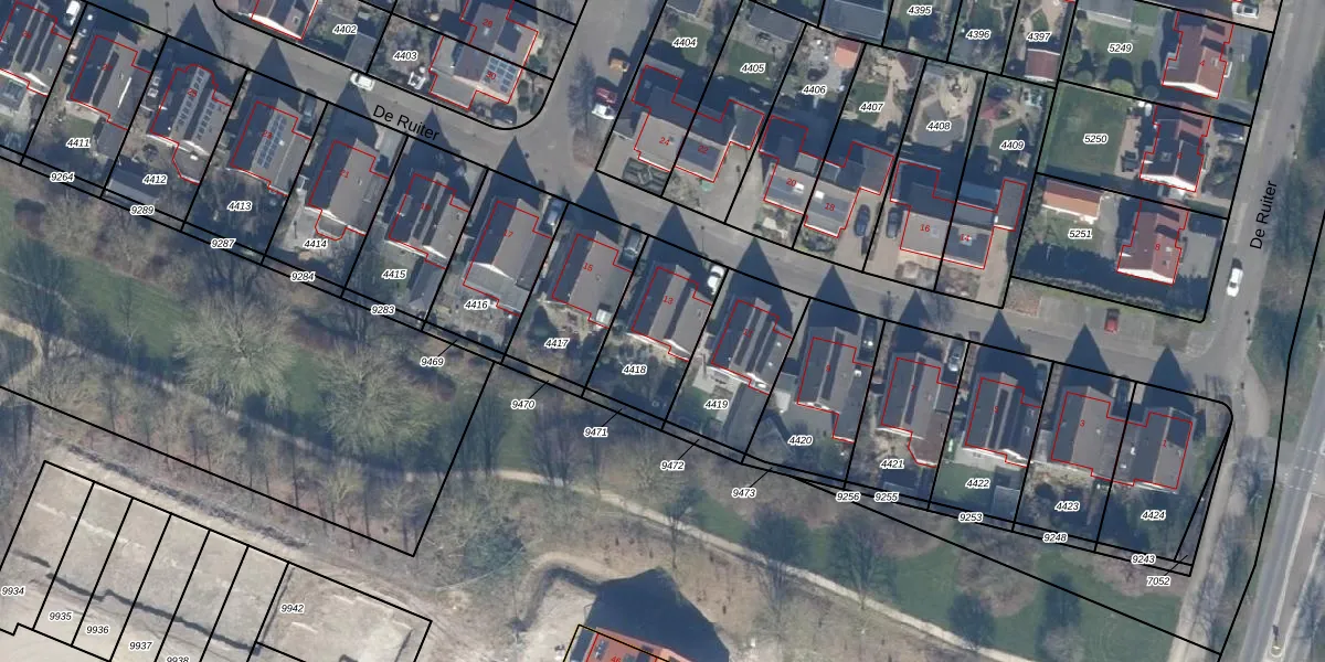 Het perceel waarop De Ruiter 13 staat heeft een oppervlakte van 326 m². Dit is een groot perceel. De perceeloppervlakte wordt geregistreerd door het Kadaster. Gedetailleerde informatie over de maten van dit perceel kunt u vinden in het rapport Kadastrale kaart met maatvoering van De Ruiter 13.