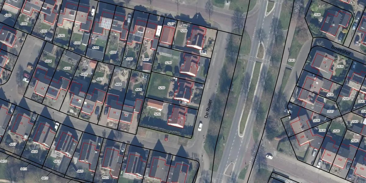 Het perceel waarop De Ruiter 6 staat heeft een oppervlakte van 435 m². Dit is een groot perceel. De perceeloppervlakte wordt geregistreerd door het Kadaster. Gedetailleerde informatie over de maten van dit perceel kunt u vinden in het rapport Kadastrale kaart met maatvoering van De Ruiter 6.