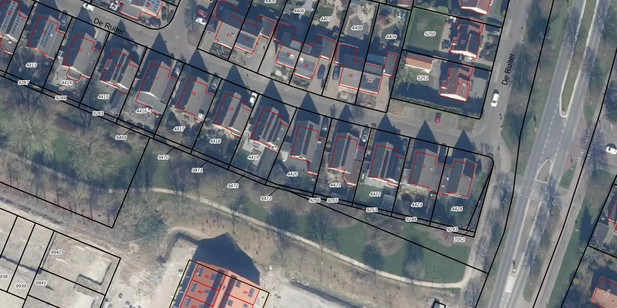 Het perceel waarop De Ruiter 9 staat heeft een oppervlakte van 350 m². Dit is een groot perceel. De perceeloppervlakte wordt geregistreerd door het Kadaster. Gedetailleerde informatie over de maten van dit perceel kunt u vinden in het rapport Kadastrale kaart met maatvoering van De Ruiter 9.