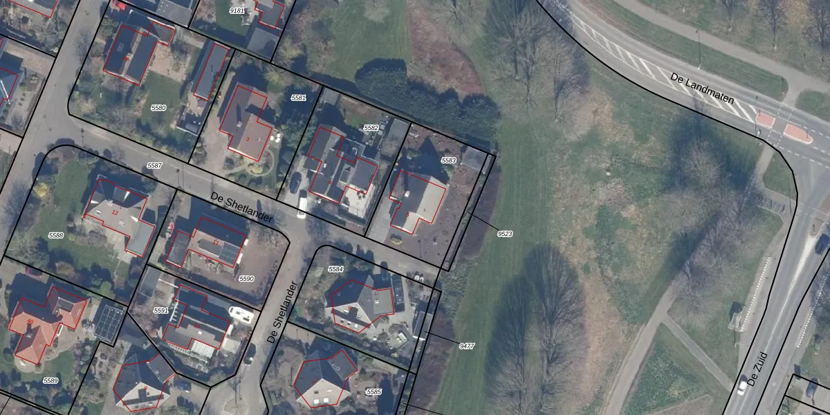Het perceel waarop De Shetlander 5 staat heeft een oppervlakte van 597 m². Dit is een groot perceel. De perceeloppervlakte wordt geregistreerd door het Kadaster. Gedetailleerde informatie over de maten van dit perceel kunt u vinden in het rapport Kadastrale kaart met maatvoering van De Shetlander 5.
