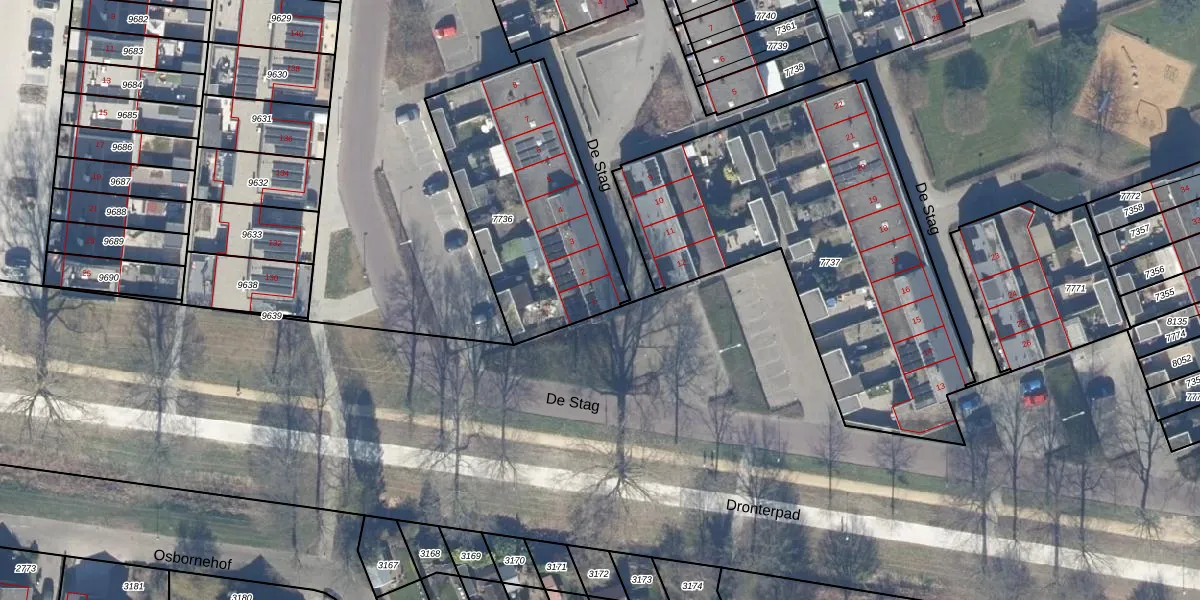 De Stag 1 is gelegen op kadastraal perceel DTN01A7736. Deze kadastrale aanduiding is uniek en wordt gebruikt door het Kadaster om eigendomsrechten en andere zakelijke rechten vast te leggen. Het perceel maakt onderdeel uit van de kadastrale gemeente Dronten.