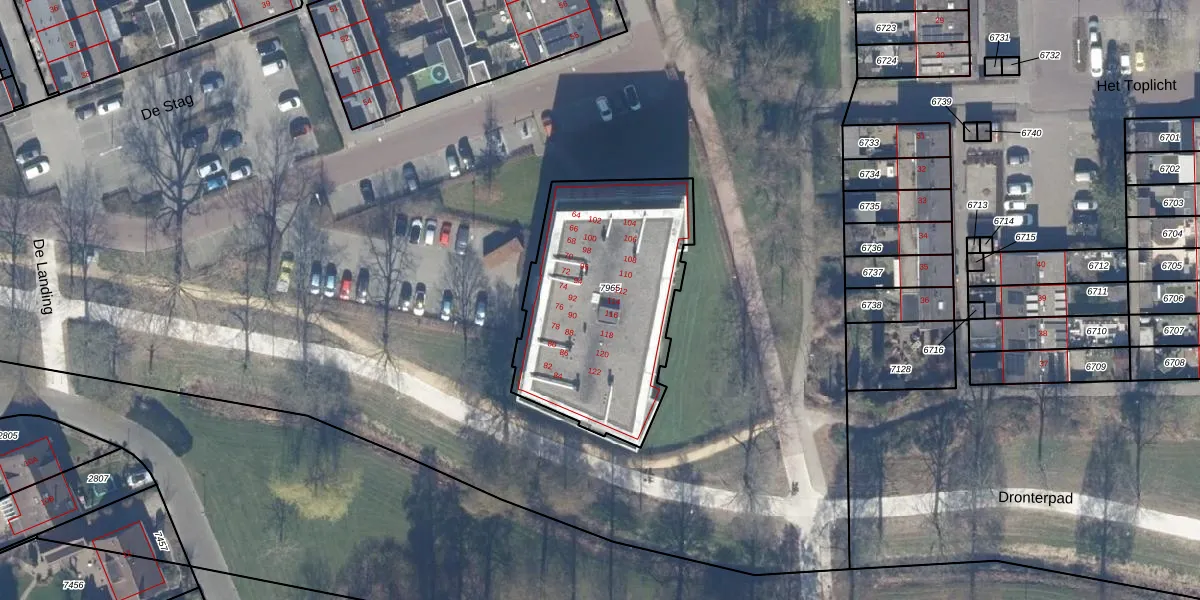 Het perceel waarop het adres ligt is DTN01-A-7965. De afkorting 'DTN01' staat voor kadastrale gemeente Dronten. De gemiddelde perceelgrootte in Dronten is 1,8 ha. Dit perceel is kleiner: de perceeloppervlakte bedraagt 998 m². Het kleinste perceel in de kadastrale gemeente is 0 m² groot. De grootste perceeloppervlakte is 25,03 km². Op het perceel zijn 30 adressen aanwezig. De huidige grenzen van het perceel zijn digitaal in de Basisregistratie Kadaster (BRK) geregistreerd op 25-10-2007.