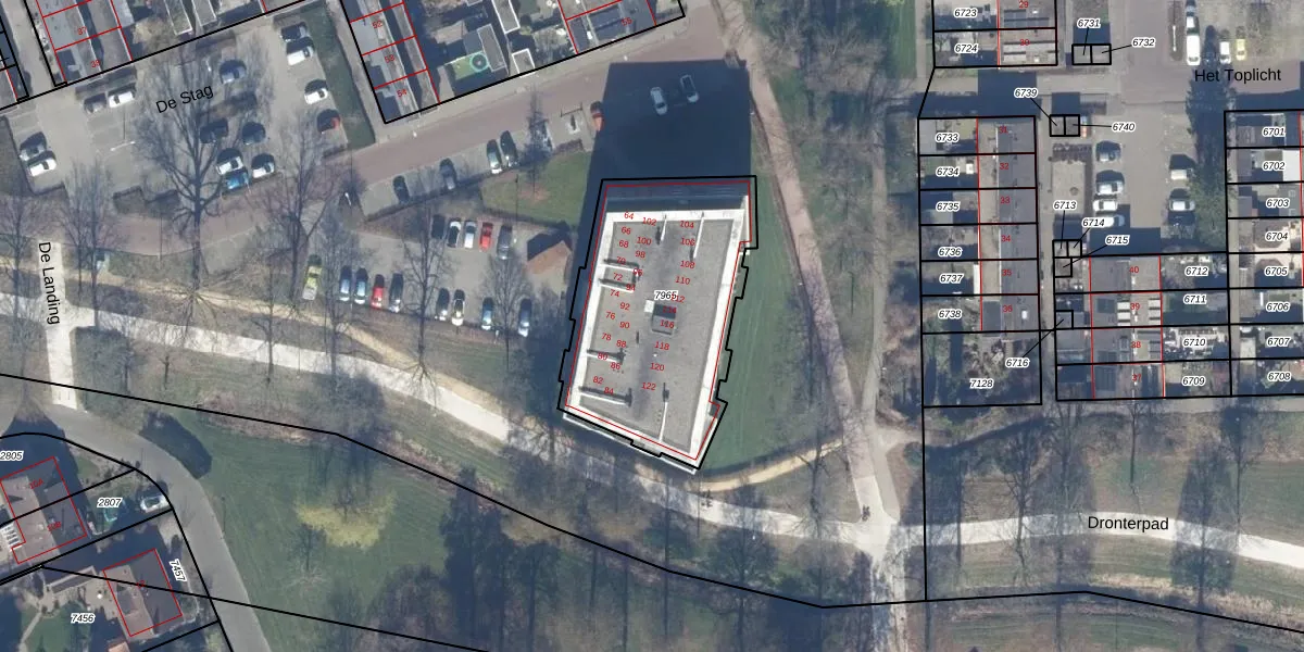 Het perceel waarop het adres ligt is DTN01-A-7965. De afkorting 'DTN01' staat voor kadastrale gemeente Dronten. De gemiddelde perceelgrootte in Dronten is 1,8 ha. Dit perceel is kleiner: de perceeloppervlakte bedraagt 998 m². Het kleinste perceel in de kadastrale gemeente is 0 m² groot. De grootste perceeloppervlakte is 25,03 km². Op het perceel zijn 30 adressen aanwezig. In de Basisregistratie Kadaster (BRK) werden de grenzen van het perceel geregistreerd op 25-10-2007.