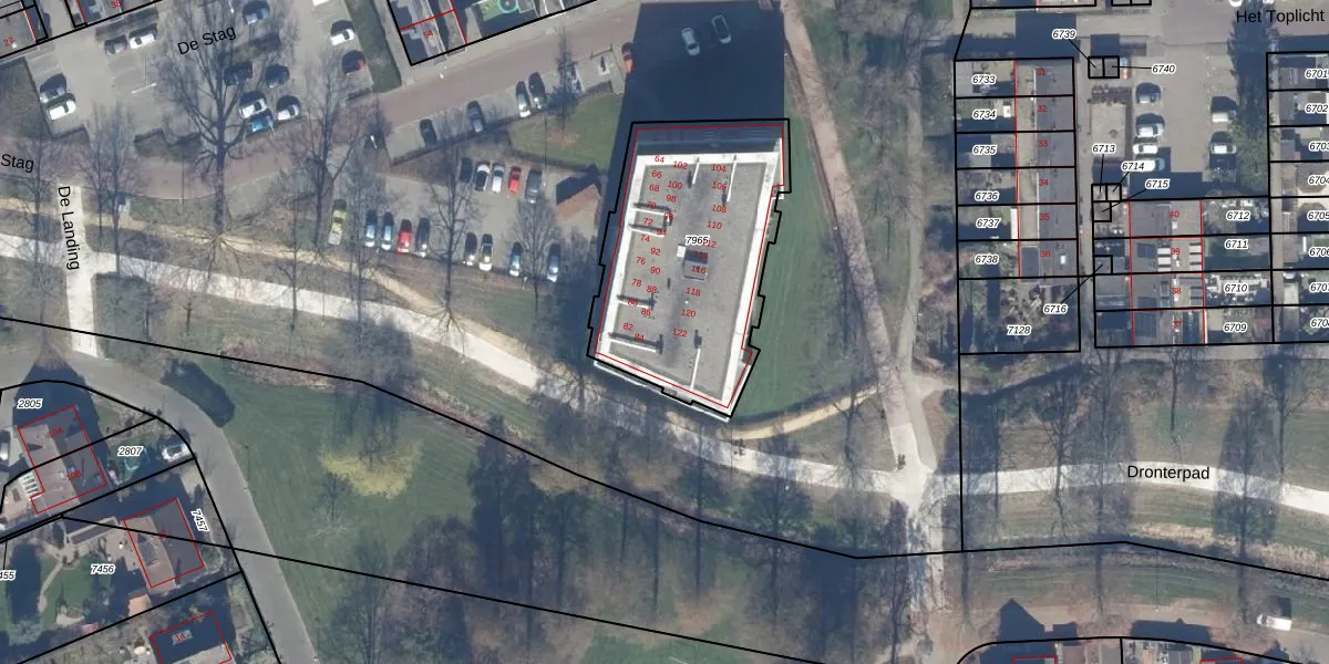 Het perceel waarop het adres ligt is DTN01-A-7965. De afkorting 'DTN01' staat voor kadastrale gemeente Dronten. De gemiddelde perceelgrootte in Dronten is 1,8 ha. Dit perceel is kleiner: de perceeloppervlakte bedraagt 998 m². Het kleinste perceel in de kadastrale gemeente is 0 m² groot. De grootste perceeloppervlakte is 25,03 km². Op het perceel zijn 30 adressen aanwezig. De huidige grenzen van het perceel zijn digitaal in de Basisregistratie Kadaster (BRK) geregistreerd op 25-10-2007.