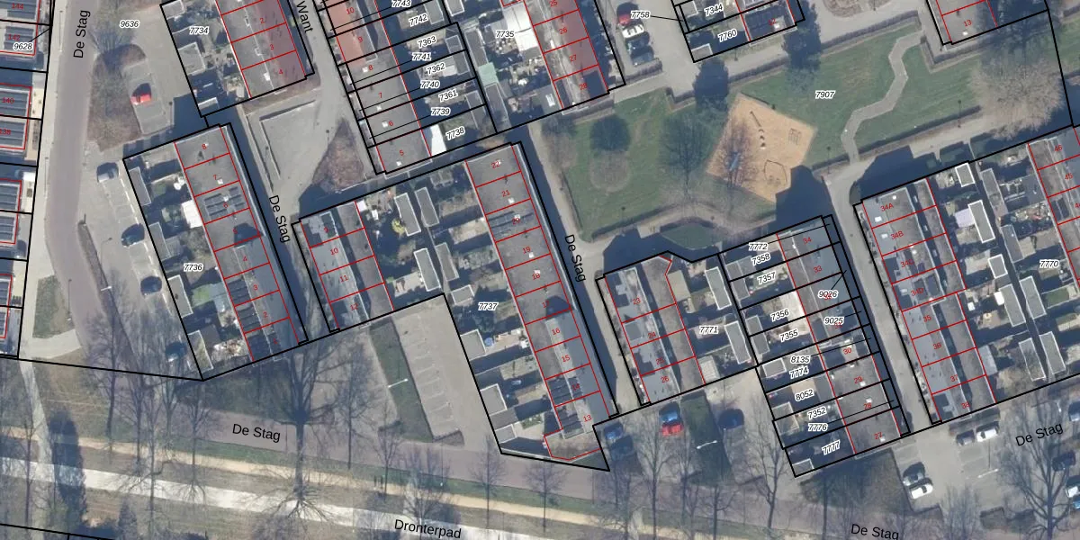 De Stag 18 is gelegen op kadastraal perceel DTN01A7737. Deze kadastrale aanduiding is uniek en wordt gebruikt door het Kadaster om eigendomsrechten en andere zakelijke rechten vast te leggen. Het perceel maakt onderdeel uit van de kadastrale gemeente Dronten.