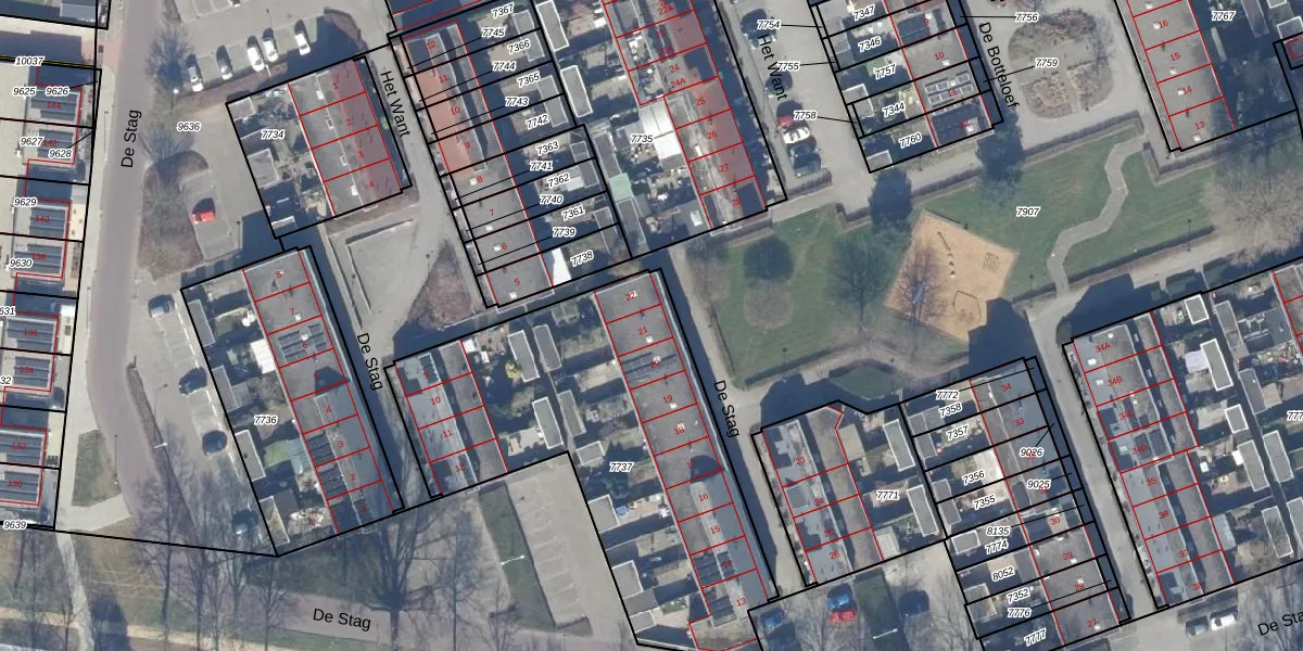 Het perceel waarop De Stag 21 staat heeft een oppervlakte van 1801 m². Dit is een zeer groot perceel. De perceeloppervlakte wordt geregistreerd door het Kadaster. Gedetailleerde informatie over de maten van dit perceel kunt u vinden in het rapport Kadastrale kaart met maatvoering van De Stag 21.