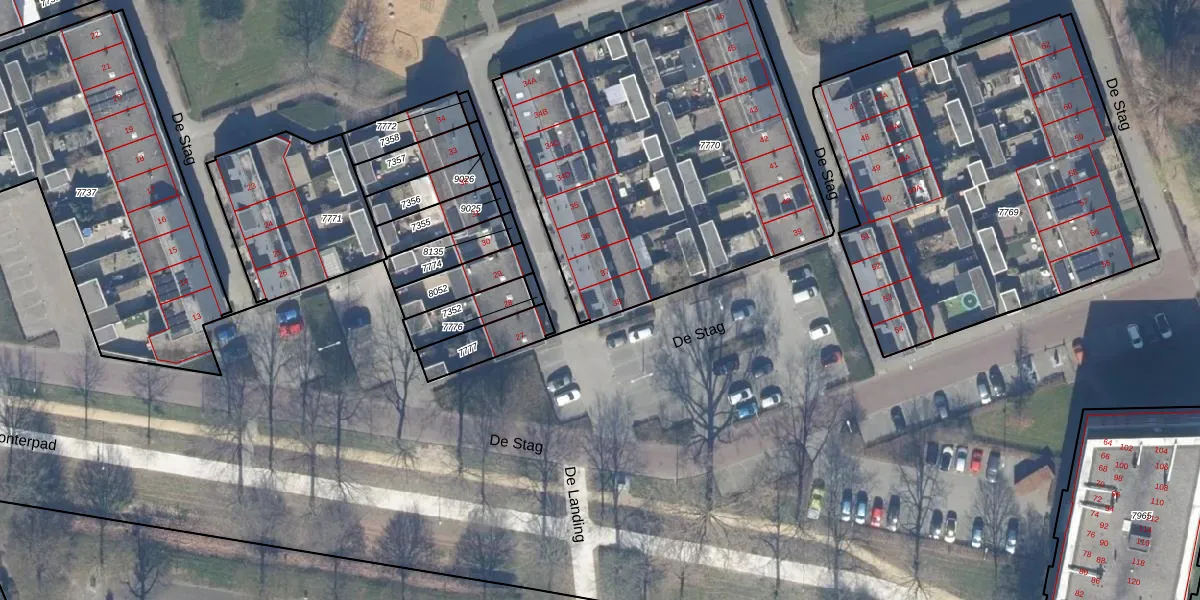 Het perceel waarop De Stag 38 staat heeft een oppervlakte van 1969 m². Dit is een zeer groot perceel. De perceeloppervlakte wordt geregistreerd door het Kadaster. Gedetailleerde informatie over de maten van dit perceel kunt u vinden in het rapport Kadastrale kaart met maatvoering van De Stag 38.