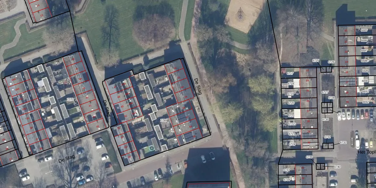 Het perceel waarop De Stag 59 staat heeft een oppervlakte van 2102 m². Dit is een zeer groot perceel. De perceeloppervlakte wordt geregistreerd door het Kadaster. Gedetailleerde informatie over de maten van dit perceel kunt u vinden in het rapport Kadastrale kaart met maatvoering van De Stag 59.