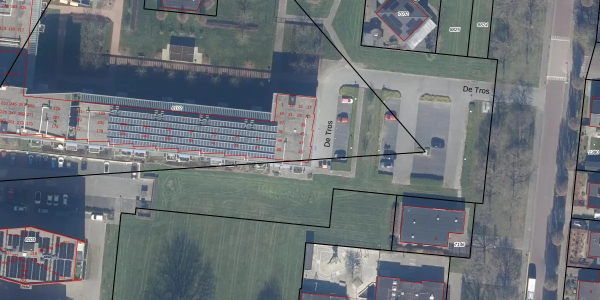 De Tros 13 is gelegen op kadastraal perceel DTN01A8102. Deze kadastrale aanduiding is uniek en wordt gebruikt door het Kadaster om eigendomsrechten en andere zakelijke rechten vast te leggen. Het perceel maakt onderdeel uit van de kadastrale gemeente Dronten.