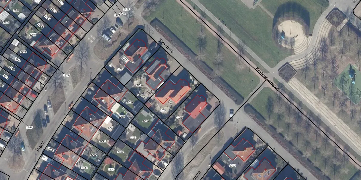 Het perceel waarop Drachme 33 staat heeft een oppervlakte van 450 m². Dit is een groot perceel. De perceeloppervlakte wordt geregistreerd door het Kadaster. Gedetailleerde informatie over de maten van dit perceel kunt u vinden in het rapport Kadastrale kaart met maatvoering van Drachme 33.