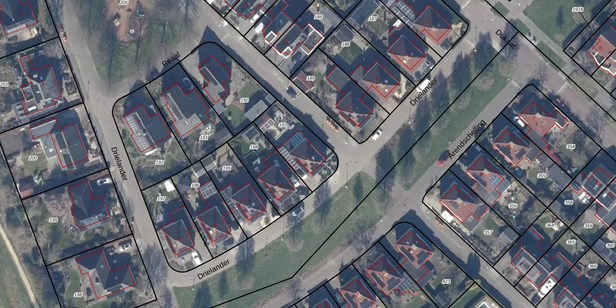 Het perceel waarop Drielander 9 staat heeft een oppervlakte van 369 m². Dit is een groot perceel. De perceeloppervlakte wordt geregistreerd door het Kadaster. Gedetailleerde informatie over de maten van dit perceel kunt u vinden in het rapport Kadastrale kaart met maatvoering van Drielander 9.