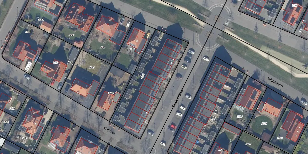Het perceel waarop Druivenpers 15 staat heeft een oppervlakte van 1583 m². Dit is een zeer groot perceel. De perceeloppervlakte wordt geregistreerd door het Kadaster. Gedetailleerde informatie over de maten van dit perceel kunt u vinden in het rapport Kadastrale kaart met maatvoering van Druivenpers 15.