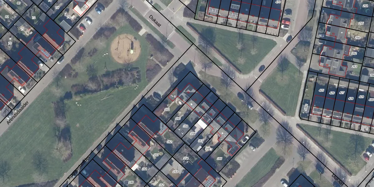 Het perceel waarop Dukaat 29 staat heeft een oppervlakte van 289 m². Dit is een middelgroot perceel. De perceeloppervlakte wordt geregistreerd door het Kadaster. Gedetailleerde informatie over de maten van dit perceel kunt u vinden in het rapport Kadastrale kaart met maatvoering van Dukaat 29.