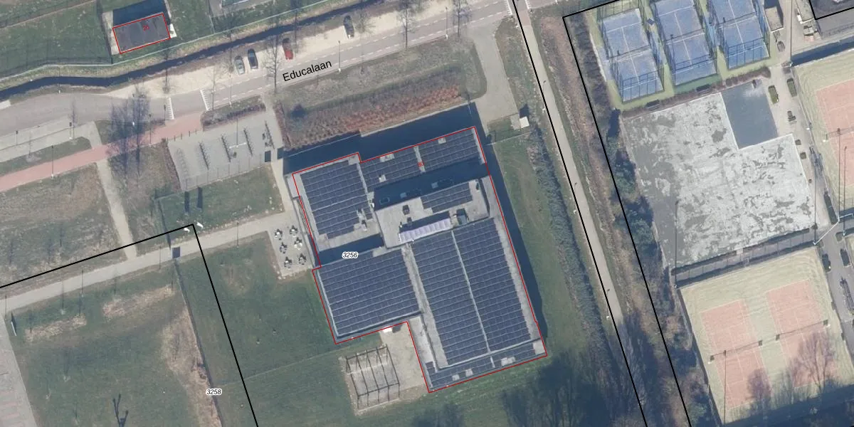 Het perceel waarop Educalaan 30 staat heeft een oppervlakte van 2,4 ha. Dit is een zeer groot perceel. De perceeloppervlakte wordt geregistreerd door het Kadaster. Gedetailleerde informatie over de maten van dit perceel kunt u vinden in het rapport Kadastrale kaart met maatvoering van Educalaan 30.