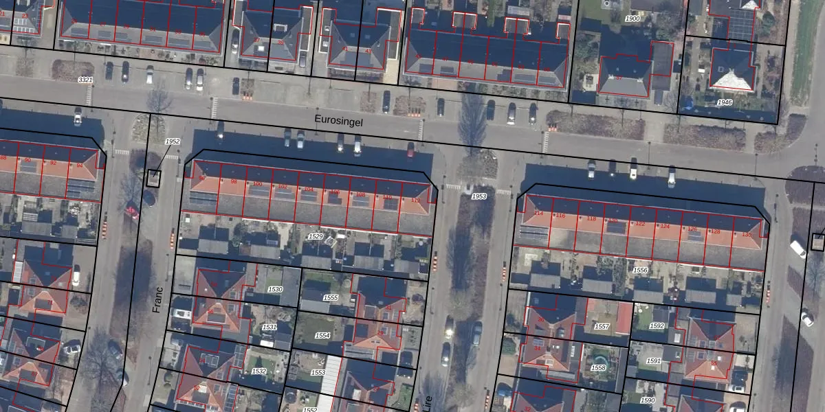 Het perceel waarop Eurosingel 112 staat heeft een oppervlakte van 1592 m². Dit is een zeer groot perceel. De perceeloppervlakte wordt geregistreerd door het Kadaster. Gedetailleerde informatie over de maten van dit perceel kunt u vinden in het rapport Kadastrale kaart met maatvoering van Eurosingel 112.