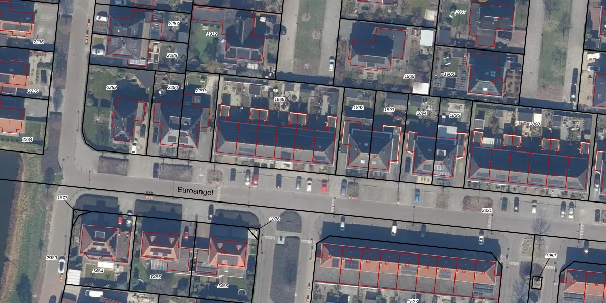 Het perceel waarop Eurosingel 13 staat heeft een oppervlakte van 1210 m². Dit is een zeer groot perceel. De perceeloppervlakte wordt geregistreerd door het Kadaster. Gedetailleerde informatie over de maten van dit perceel kunt u vinden in het rapport Kadastrale kaart met maatvoering van Eurosingel 13.