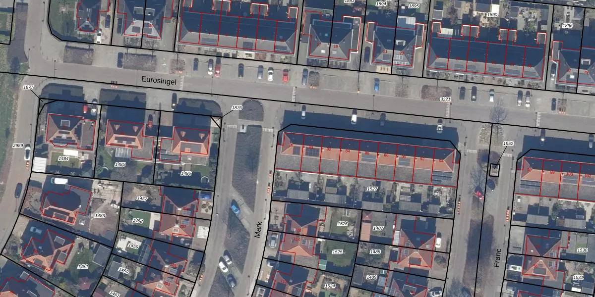 Het perceel waarop Eurosingel 78 staat heeft een oppervlakte van 1596 m². Dit is een zeer groot perceel. De perceeloppervlakte wordt geregistreerd door het Kadaster. Gedetailleerde informatie over de maten van dit perceel kunt u vinden in het rapport Kadastrale kaart met maatvoering van Eurosingel 78.