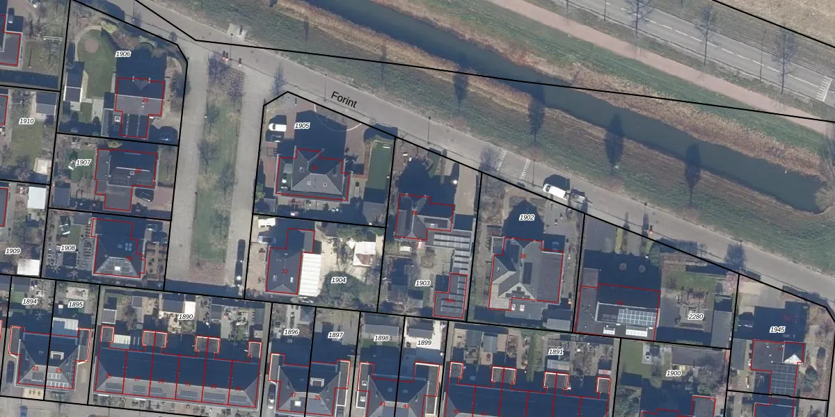 Het perceel waarop Forint 36 staat heeft een oppervlakte van 847 m². Dit is een groot perceel. De perceeloppervlakte wordt geregistreerd door het Kadaster. Gedetailleerde informatie over de maten van dit perceel kunt u vinden in het rapport Kadastrale kaart met maatvoering van Forint 36.